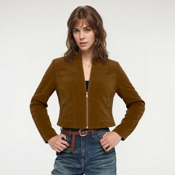 Chaqueta corta ajustada personalizada para mujer, chaqueta de moto de ante de manga larga con cremallera completa y cuello levantado para primavera y otoño